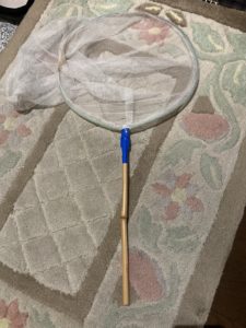 我が家では、100均で買った”虫取り網” の枝の部分を短く切って、蚊取り用に枕元に置いています(下の写真です)。